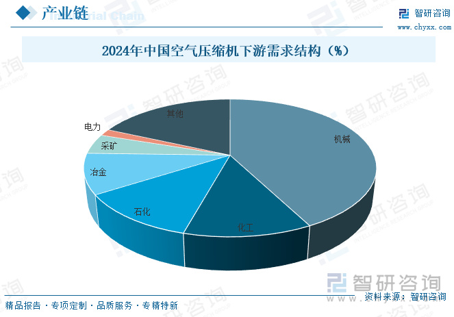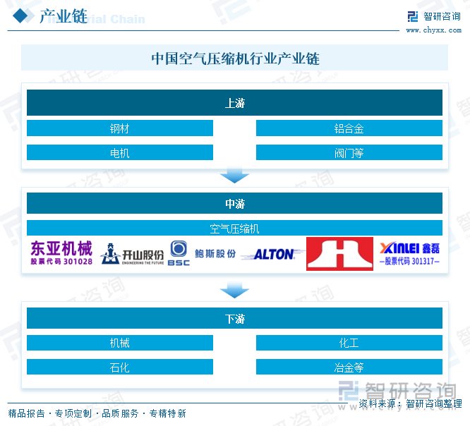 空气压缩机行业上游主要包括钢材、铝合金等金属材料供应商以及电机、阀门、钢铁铸件等零部件供应商,其中,金属材料价格和质量直接影响空气压缩机的制造成本和性能,而零部件多为标准化机电产品,其供应稳定性对空压机生产至关重要;行业中游为空气压缩机生产制造;行业下游为应用市场,涵盖机械、化工、石化、冶金、采矿、电力等诸多领域。