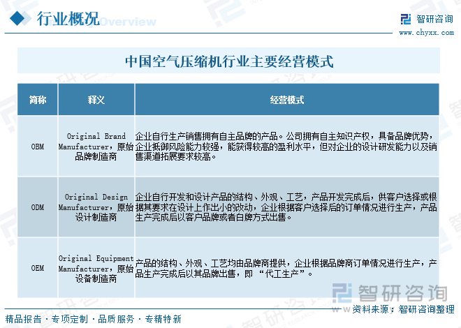 我国空气压缩机三种经营模式主要包括原始品牌制造商(OBM)、原始设计制造商(ODM)与原始设备制造商(OEM)三种模式。目前,国内具有丰富行业经验、具备产品自主开发能力的生产商已经实现了从OEM到ODM的转型;部分优势企业已开始向OBM方式过渡。
