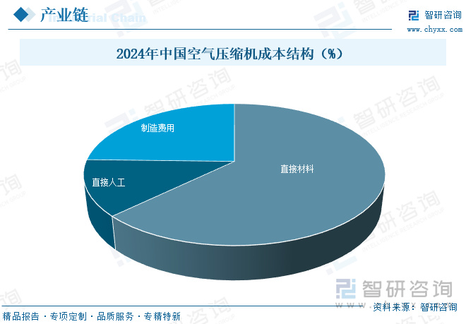 从上游成本结构来看,包括钢材、铝合金、电机、阀门、钢铁铸件在内的直接材料占比最大,超60%,因此,空气压缩机企业需要与上游建立长期稳定且深度协同的合作关系,一方面,要对关键材料供应商进行严格筛选与管控,通过定期审核、技术帮扶等方式,确保材料质量稳定,满足产品高精度、高可靠性要求,从源头把控成本与品质;另一方面,可推动与供应商的联合研发,基于产品迭代需求,共同探索新型、低成本且性能更优的材料,降低直接材料采购成本,同时提升产品差异化竞争力。